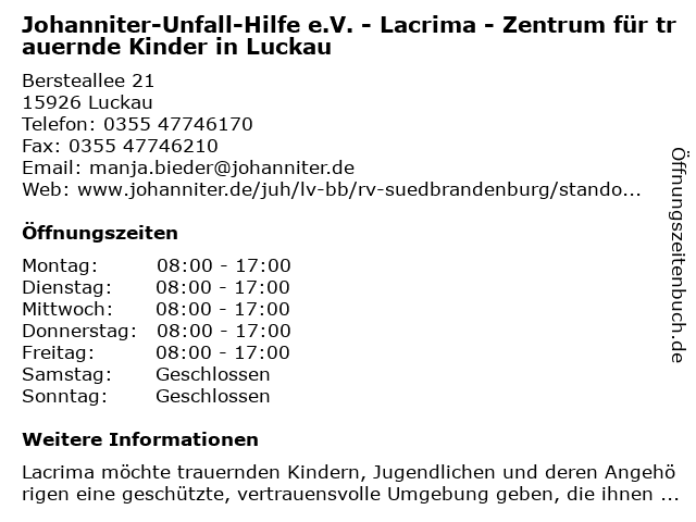 Branchen & Suchbegriffe zu Johanniter-Unfall-Hilfe e.V. - Lacrima - Zentrum für trauernde Kinder in Luckau:e.v., gemeinnützige organisation, hilfe, hilfsorganisation, johanniter, kinder, lacrima, trauernde, unfall, verband, wohlfahrtseinrichtung, zentrum |