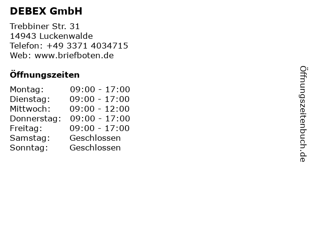 | Öffnungszeiten DEBEX GmbH in Luckenwalde anzeigen | |