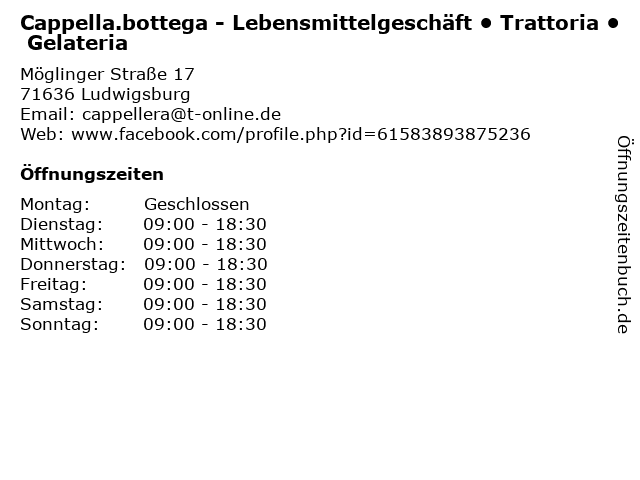 | Öffnungszeiten Cappella.bottega - Lebensmittelgeschäft • Trattoria • Gelateria in Ludwigsburg anzeigen | |