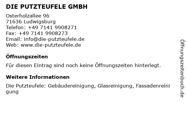 | Öffnungszeiten DIE PUTZTEUFELE GMBH in Ludwigsburg anzeigen | |