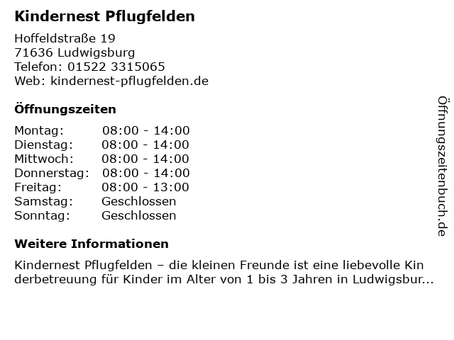 | Öffnungszeiten Kindernest Pflugfelden in Ludwigsburg anzeigen | |