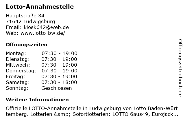 | Öffnungszeiten Lotto-Annahmestelle in Ludwigsburg anzeigen | |