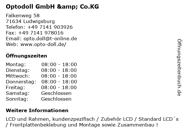 | Öffnungszeiten Optodoll GmbH & Co.KG in Ludwigsburg anzeigen | |