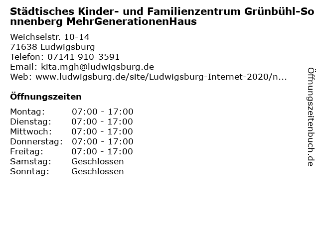 2 Kinder- und Familienzentrum im Mehrgenerationenhaus Am Sonnenberg (Entfernung: 0,45 km) Am Sonnenberg 22, 71638 Ludwigsburg 3 Städtisches Kinder- und Familienzentrum Hartenecker Höhe (Entfernung: 1,92 km) Anna-Neff-Straße 1, 71640 Ludwigsburg 4 Evang. Kinder- u. Familienzentrum bei der Kreuzkirche (Entfernung: 1,92 km) Auf dem Wasen 33, 71640 Ludwigsburg 5 Katholisches Kinder- u. Familienzentrum St. Martin (Entfernung: 2,67 km) Uhlandstraße 20, 71634 Ludwigsburg 6 |