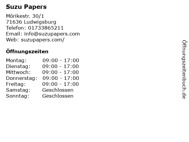 Öffnungszeiten Suzu Papers in Ludwigsburg anzeigen | |