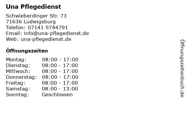 | Öffnungszeiten Una Pflegedienst in Ludwigsburg anzeigen | |