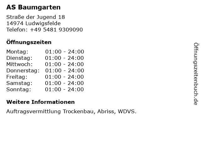 | Öffnungszeiten AS Baumgarten in Ludwigsfelde anzeigen | |
