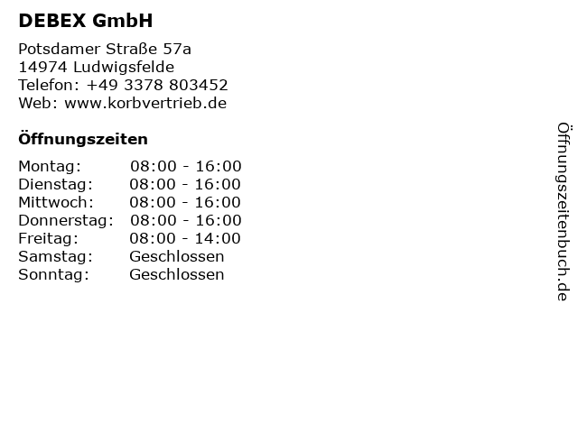 | Öffnungszeiten DEBEX GmbH in Ludwigsfelde anzeigen | |