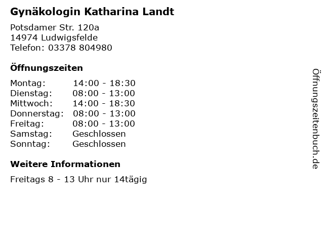 1 Frauenärztinnen Dr. med. Ulrike Krüger und Dr. Katharina Landt (Entfernung: 0,02 km) Potsdamer Str. 120A, 14974 Ludwigsfelde 4 Kinesiologische Beratung und Coaching Katharina Otto (Entfernung: 14,29 km) Frobenstr. 3, 12249 Berlin 6 Katharina Dall Armi Psychotherapie für Kinder und Jugendliche (Entfernung: 15,42 km) Im Gestell 16, 14169 Berlin |