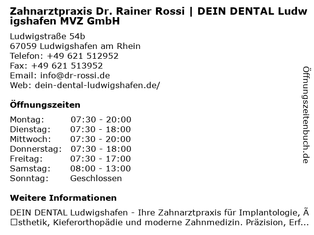 1 Engeldent - Zahnarztpraxis Dr. Al Khatib Fachzahnarzt für Oralchirurgie / Implantologie Dr. Ghaleb Al Khatib (Entfernung: 0,12 km) Bahnhofstraße 3, 67059 Ludwigshafen 3 Rainer Herrwerth Gas- und Wasserinstallation (Entfernung: 0,52 km) Dörrhorststr. 1, 67059 Ludwigshafen am Rhein 6 |
