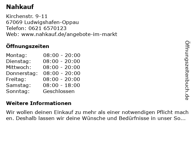 | Öffnungszeiten Nahkauf in Ludwigshafen-Oppau anzeigen | |