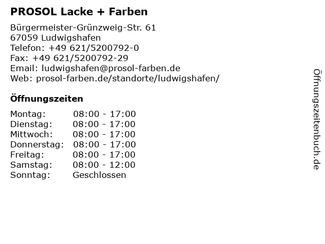 | Öffnungszeiten PROSOL Lacke + Farben in Ludwigshafen anzeigen | |