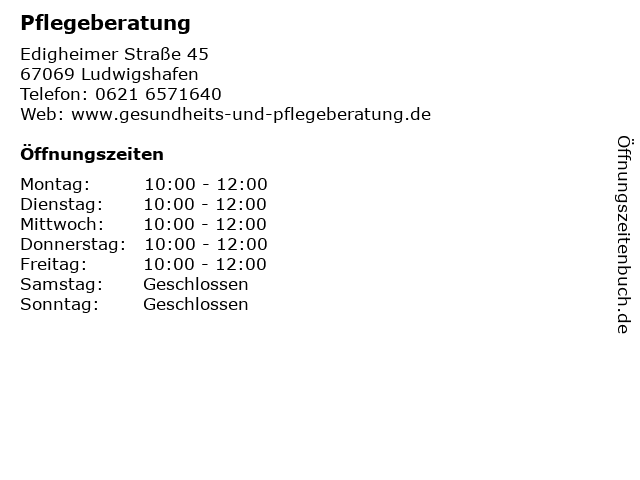 | Öffnungszeiten Pflegeberatung in Ludwigshafen anzeigen | |