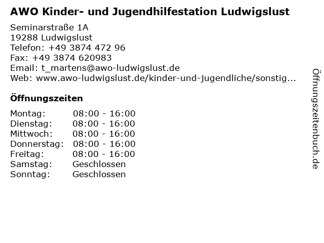 3 Arbeiterwohlfahrt Kreisverband Ludwigslust-Hagenow e.V. Kinder und Jugendhilfestation (Entfernung: 0,90 km) Laascher Weg 16, 19288 Ludwigslust 6 |