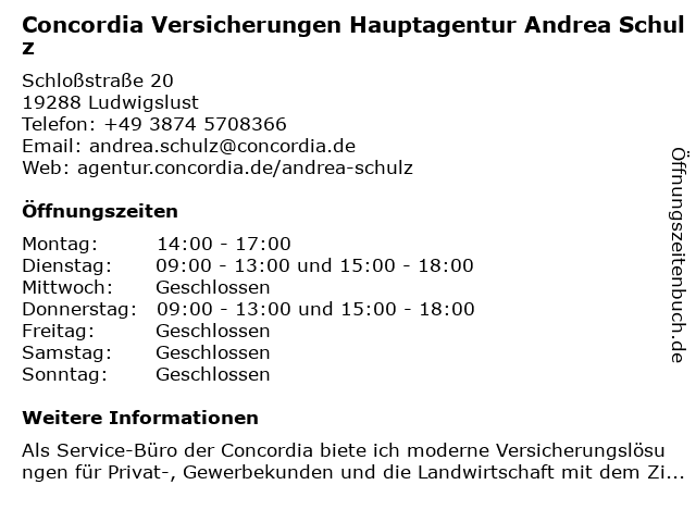 Branchen & Suchbegriffe zu Concordia Versicherungen Hauptagentur Andrea Schulz:andrea, concordia, hauptagentur, schulz, versicherungen, versicherungsagentur |