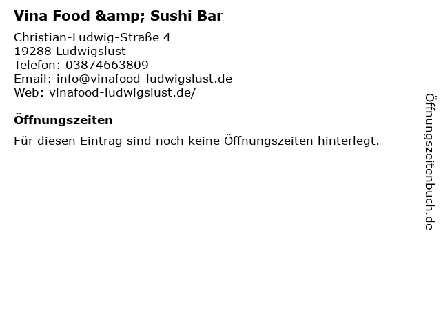 | Öffnungszeiten Vina Food & Sushi Bar in Ludwigslust anzeigen | |