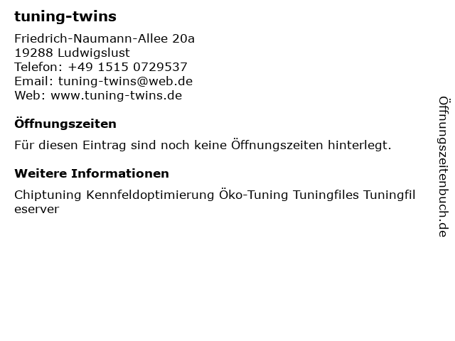 | Öffnungszeiten tuning-twins in Ludwigslust anzeigen | |