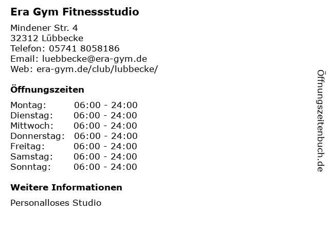 | Öffnungszeiten Era Gym Fitnessstudio in Lübbecke anzeigen | |