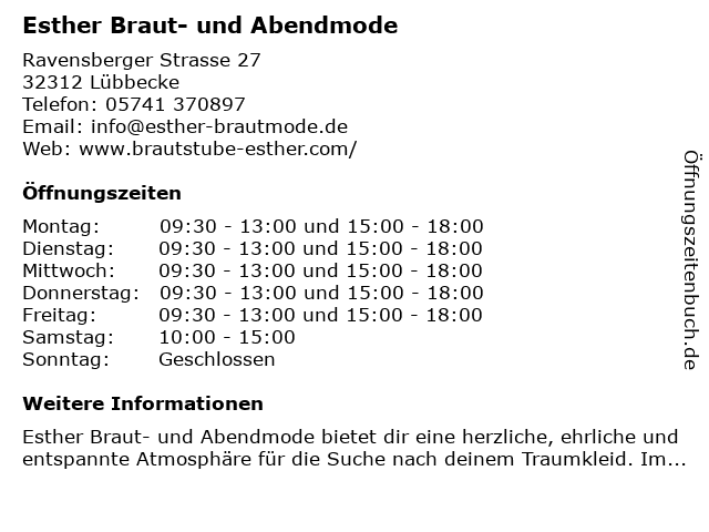 Öffnungszeiten Esther Braut- und Abendmode in Lübbecke anzeigen | |