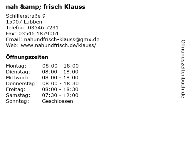 | Öffnungszeiten nah & frisch Klauss in Lübben anzeigen | |