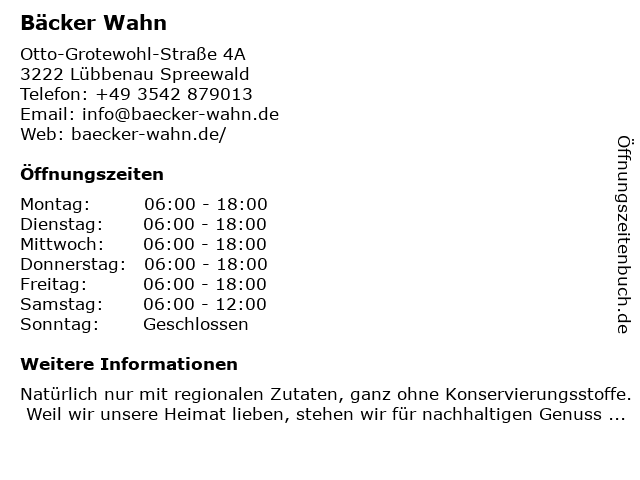 | Öffnungszeiten Bäcker Wahn in Lübbenau Spreewald anzeigen | |