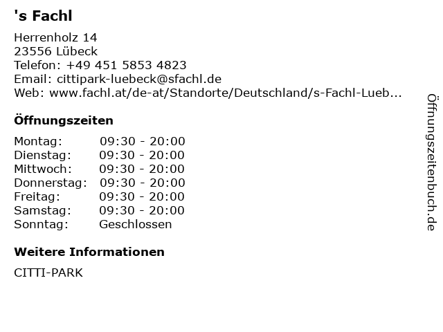 | Öffnungszeiten 's Fachl in Lübeck anzeigen | |