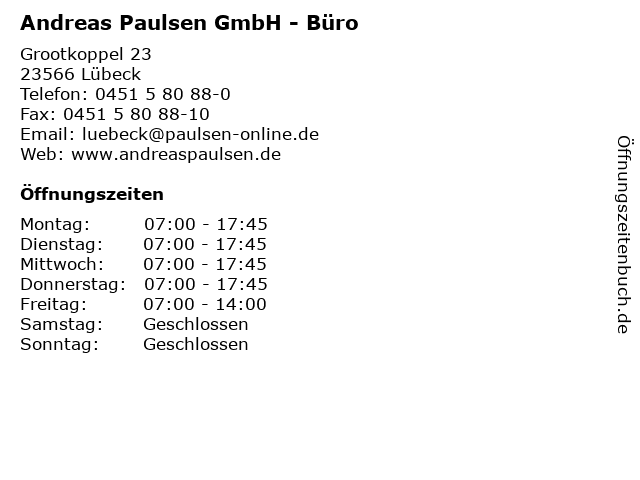 | Öffnungszeiten Andreas Paulsen GmbH - Büro in Lübeck anzeigen | |