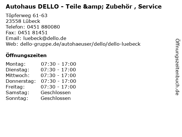 3 Hans Voss Automobile - Verkauf Teile & Zubehör (Entfernung: 3,33 km) Posener Strasse 7a, 23554 Lübeck 6 Ernst Dello GmbH & Co. KG (Teile & Zubehör) (Entfernung: 7,02 km) Eutiner Straße 4, 23611 Bad Schwartau |