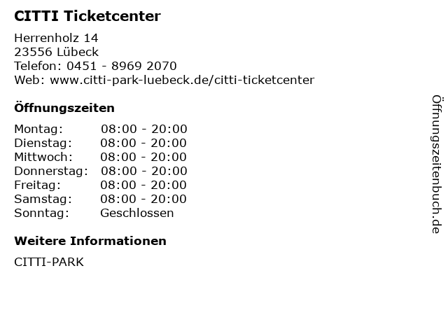 | Öffnungszeiten CITTI Ticketcenter in Lübeck anzeigen | |