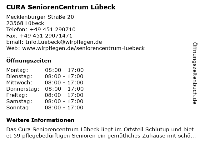| Öffnungszeiten CURA SeniorenCentrum Lübeck in Lübeck anzeigen | |