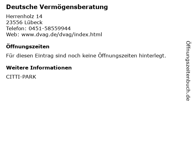 | Öffnungszeiten Deutsche Vermögensberatung in Lübeck anzeigen | |
