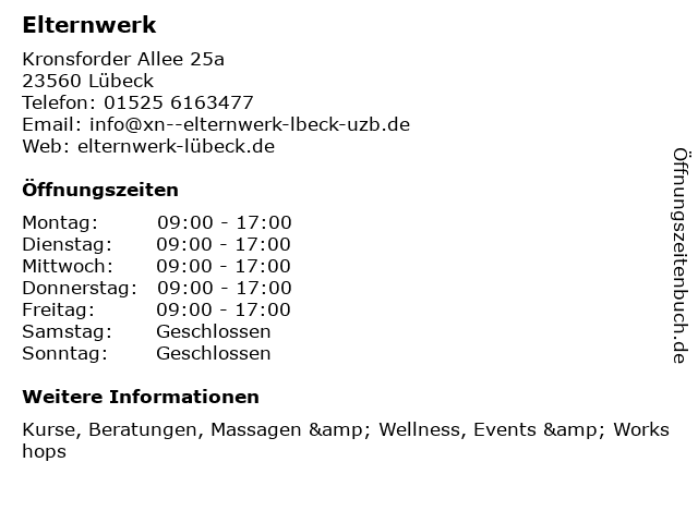 | Öffnungszeiten Elternwerk in Lübeck anzeigen | |