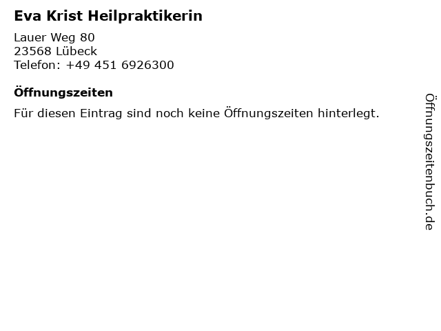 | Öffnungszeiten Eva Krist Heilpraktikerin in Lübeck anzeigen | |