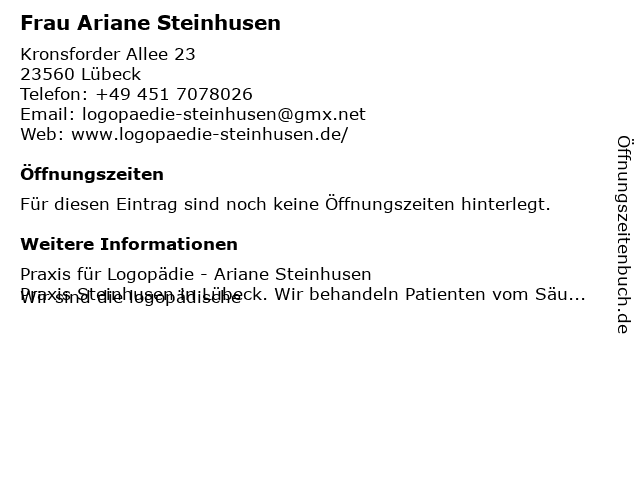| Öffnungszeiten Frau Ariane Steinhusen in Lübeck anzeigen | |