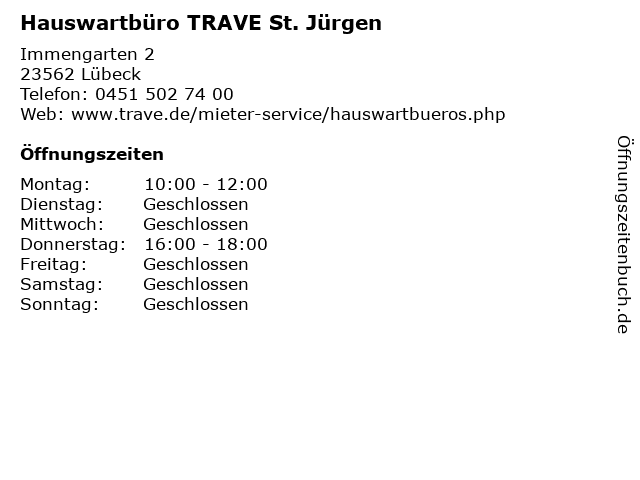 | Öffnungszeiten Hauswartbüro TRAVE St. Jürgen in Lübeck anzeigen | |