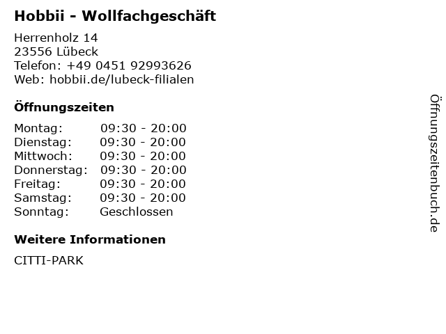 | Öffnungszeiten Hobbii - Wollfachgeschäft in Lübeck anzeigen | |