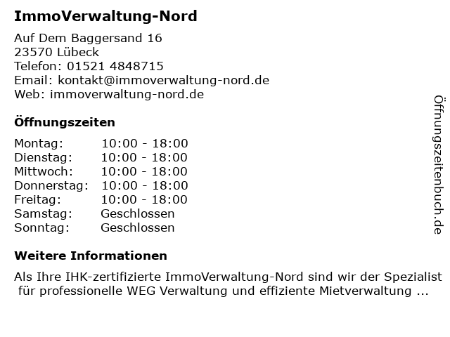 | Öffnungszeiten ImmoVerwaltung-Nord in Lübeck anzeigen | |