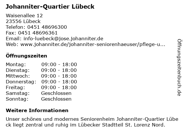 | Öffnungszeiten Johanniter-Quartier Lübeck in Lübeck anzeigen | |