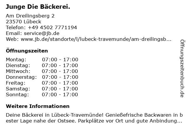 | Öffnungszeiten Junge Die Bäckerei. in Lübeck anzeigen | |