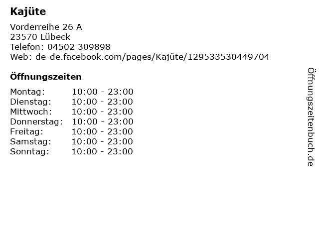 | Öffnungszeiten Kajüte in Lübeck anzeigen | |