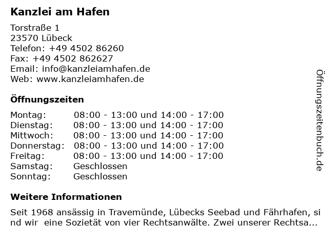 | Öffnungszeiten Kanzlei am Hafen in Lübeck anzeigen | |