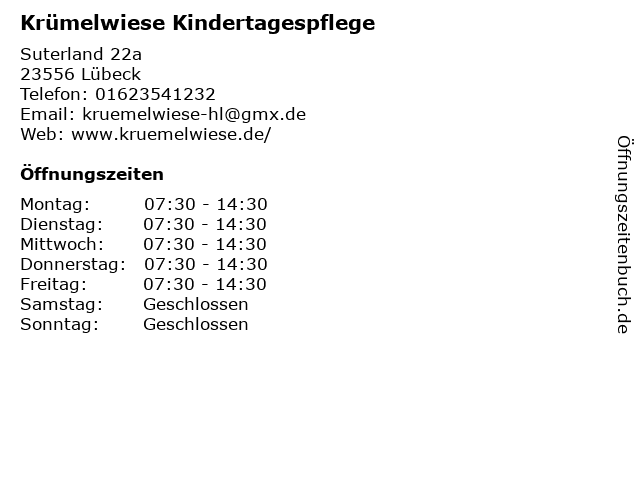 | Öffnungszeiten Krümelwiese Kindertagespflege in Lübeck anzeigen | |