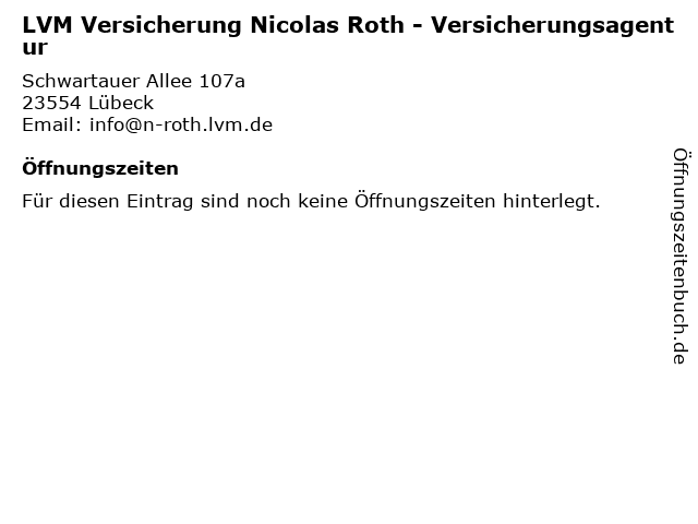| Öffnungszeiten LVM Versicherung Nicolas Roth - Versicherungsagentur in Lübeck anzeigen | |