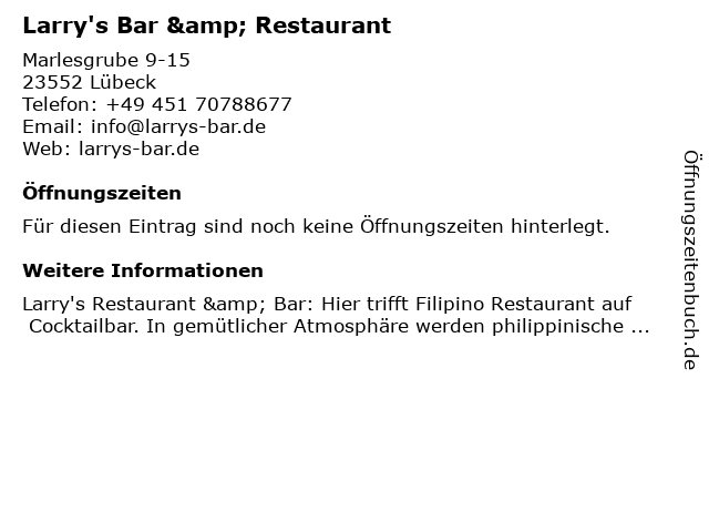 | Öffnungszeiten Larry's Bar & Restaurant in Lübeck anzeigen | |