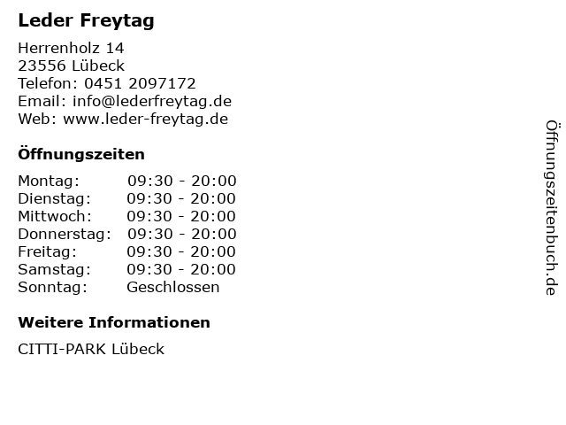 | Öffnungszeiten Leder Freytag in Lübeck anzeigen | |