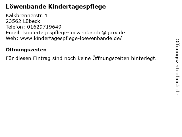 | Öffnungszeiten Löwenbande Kindertagespflege in Lübeck anzeigen | |