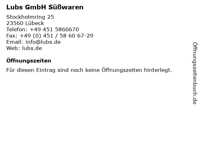 | Öffnungszeiten Lubs GmbH Süßwaren in Lübeck anzeigen | |