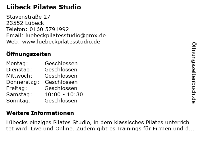 | Öffnungszeiten Lübeck Pilates Studio in Lübeck anzeigen | |