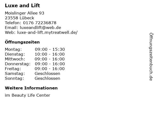 | Öffnungszeiten Luxe and Lift in Lübeck anzeigen | |