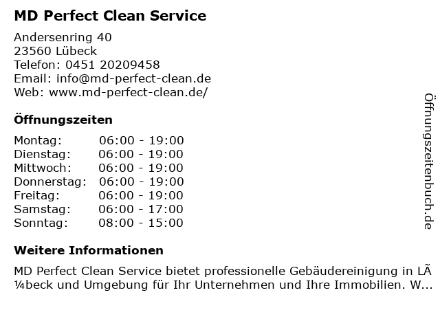 | Öffnungszeiten MD Perfect Clean Service in Lübeck anzeigen | |